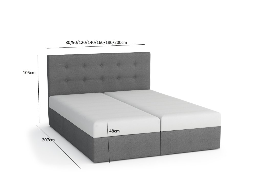 | Rozměry spací plochy | 80 × 202 cm | 90 × 202 cm | 140 × 202 cm | 160 × 202 cm | 180 × 202 cm | 200 × 202 cm |