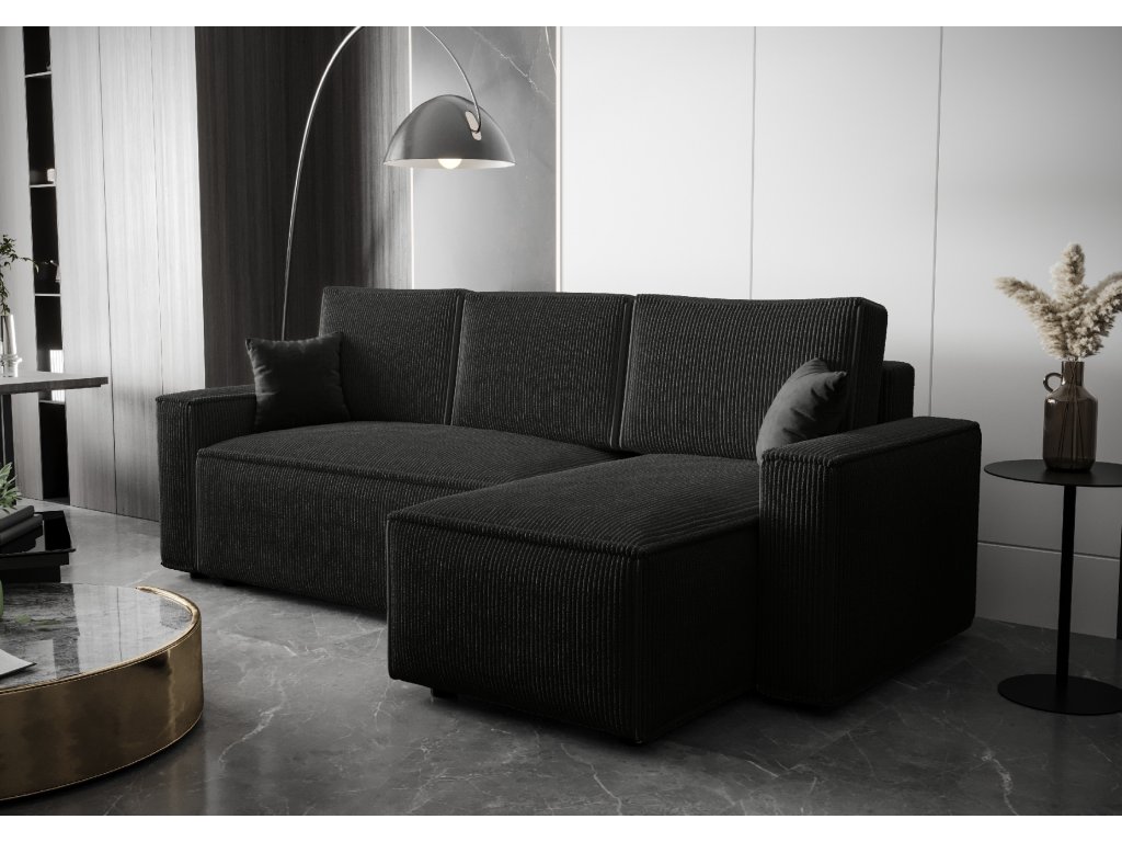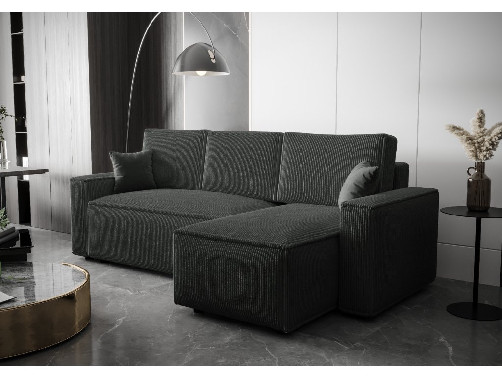 Rohová sedací souprava má funkci spaní a má vestavěný kontejner na lůžkoviny.